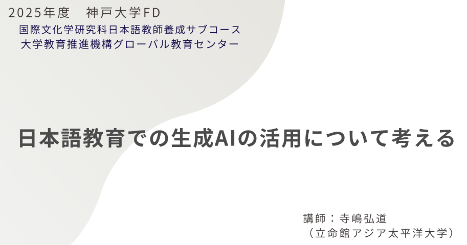 実施報告:35名(内訳:教員23名、学生・職員等12名)の参加があり、盛会でした。教育を取り巻く環境が激変する中で、教師が自身の知見をアップデートしておくことの重要性を感じる良い機会となりました。 ![]() 開催通知 サブコースでは、グローバル教育センター(GEC)との共催で、日本語教育での生成AI活用をテーマに特別講演会(FDセミナー)を開催します。なお、本イベントは学内限定です。 概要 ・2025/8/27(水) 10:00-11:50 オンライン実施 ・講師 寺嶋弘道先生(立命館アジア太平洋大学准教授) ・演題 「日本語教育での生成AIの活用について考える」 。内容 このFDではChatGPTに焦点を当て、日本語教育で生成AI を活用する際の基礎的な知識や考え方について学びます。 |