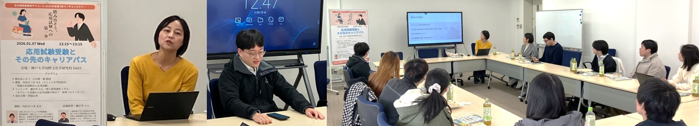 (実施報告) 当日は20名(他大学の院生3名含む)の参加があり、非常に盛況でした。まず、内田先生より、登録日本語教員になることが人生のオプションを広げること、さらに、登録日本語教員には日本語学校教員になるだけでなく、多様な働き方がありうることをご教授いただきました。また、廉沢奇氏からは、11月の受験経験をふまえ、試験までの学修方法や、当日の対策などについて非常に有益な情報提供をいただきました。参加者の皆さんには、刺激の多い時間になったことと思います。本学に限らず、応用試験についてはまだなじみが薄く、受験を先延ばしにしてしまう傾向もあるようですが、内田先生や廉さんの言葉にもあったように、平素の学修で関連の知識と日常的に触れているM2の段階で受験・合格し、国家資格を得て修了されることが望ましいと思われます。本学では、新課程の1期生がM2になる次年度においても、出願指導などを丁寧に行っていきたく思っています。(文責:石川) ![]() ・・・・・・・・・・・・・・・・・・・・・・・・・・・ (企画趣旨) 神戸大学は、登録日本語教員養成機関・登録実践研修機関であり、本学の「日本語教師養成サブコース」の課程を履修することで、登録日本語教員となる3要件のうち、基礎試験受験と教壇実習が免除されますが、応用試験については各自で受験して合格する必要があります。ただ、応用試験は始まったばかりで、試験準備のノウハウも十分に共有されていません。今回は、コミュニカ学院の内田校長をお招きし、応用試験の位置づけや、その先の日本語教員のキャリアについてご講演をいただきます。また、サブコース修了生で、2025年の応用試験に合格された廉沢奇さんに試験対策の方法などを紹介してもらいます。応用試験受験予定者にとってはまたとない機会になると思いますので、多数のご参加をお待ちしています。※本イベントは、学外にも開放しています。 概要 ●日時 2026年1月7日(水) 12:15~13:15(終了後、自由参加の懇談会を予定) ●会場 神戸大学鶴甲第1キャンパス D603 ●プログラム 1215~ 開会あいさつ 石川 慎一郎教授 1215~1300 講演 内田さつき先生(コミュニカ学院校長)「登録日本語教員と応用試験」 (概要)本講演では、登録日本語教員の資格を取得する意味や意義についてお話しし、日本語教師のキャリアの考え方や広がり、さらに応用試験を受験するための心構えや効果的な学習の進め方についてご説明します。 1300~1310 ミニトーク 廉沢奇さん(博士後期課程2年生)「サブコース受講から応用試験合格まで:後輩へのメッセージ」 (概要)本ミニトークでは、神戸大のサブコース受講を経て、本年の応用試験受験に臨むまでの過程、また、応用試験合格のために行った準備法などについて後輩の皆さんにお話しします。 1310~ 意見交換、質疑応答 |